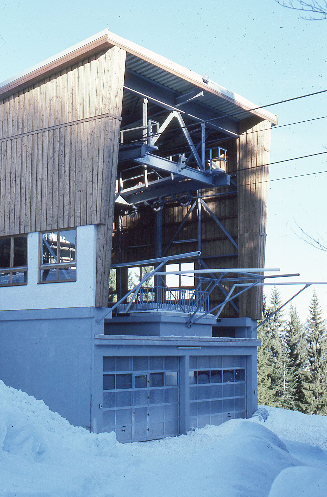 Bei dieser Bahn sollte es sich um eine möglichst einfache Anlage handeln, denn weder im Bereich der Talstation, noch bei der Bergstation gab es nennenswerte Infrastruktur wie beispielsweise Restaurationsbetriebe. So wurde etwa die Bergstation (Umlenkstation) – bei Pendelbahnen eher ungewöhnlich – als offene Station ausgeführt (Abb. 1), auch die Talstation wurde architektonisch eher schlicht gestaltet (Abb. 2).