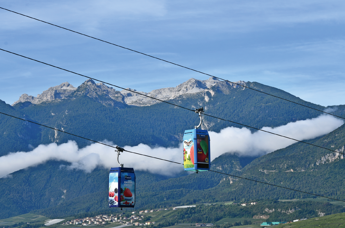 Unter der Bezeichnung „Apfelseilbahn“ realisierten Leitner und Melinda in Norditalien eine Materialseilbahn zum Transport von Äpfeln und vermeiden damit 5.000 LKW-Fahrten.