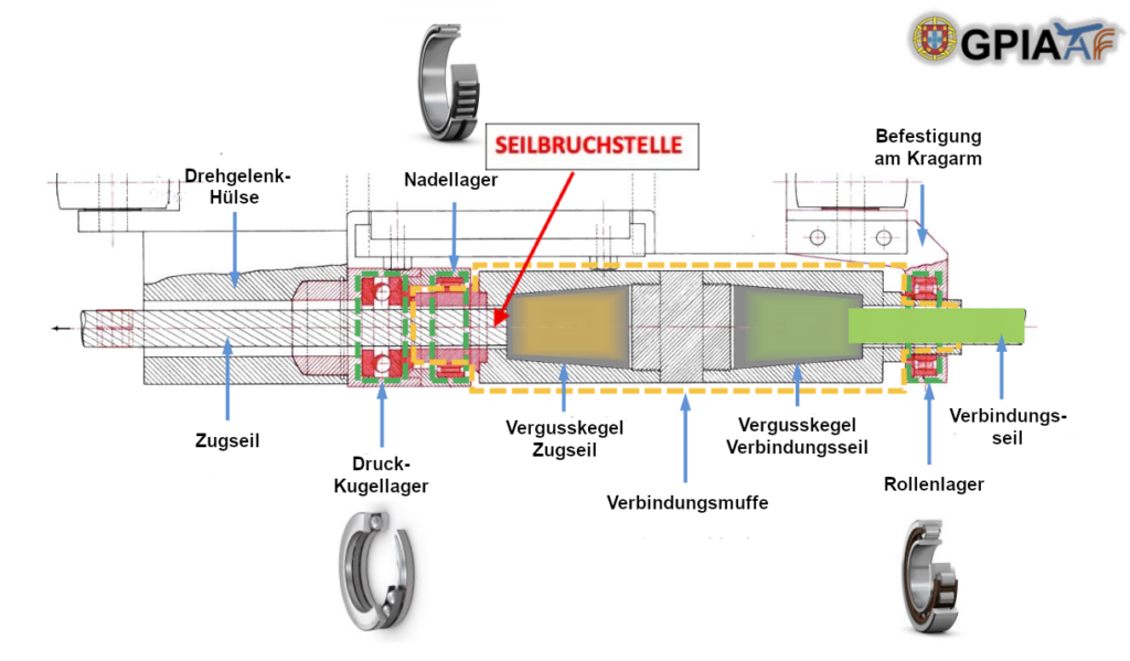 Es handelt sich dabei um eine sehr selten angewandte Konstruktion, die dem Zugseil an der Endbefestigung die freie Drehung um die Seilachse ermöglicht. Daher wird diese Art der Endbefestigung auch als Drehgelenk bezeichnet. Das Zugseil ist am oberen Kragarm mit einem Vergusskegel in einer Vergussmuffe gelagert, die die Verbindung zum Vergusskegel des Verbindungsseiles herstellt. Diese Verbindungsmuffe stützt sich gegen die Hülse des Drehgelenks ab, wobei ein Druck-Kugellager, ein Nadellager und ein Rollenlager ihre Drehung um die Längsachse ermöglichen. Die Endbefestigung des Verbindungsseiles am unteren Kragarm erfolgt auf ähnliche Art. (Interessanterweise wird im Untersuchungsbericht der GPIAAF auf die Seilspannkraft-Verteilung zwischen der Zugseil-Endbefestigung am oberen Kragarm und der Verbindungsseil-Endbefestigung am unteren Kragarm nicht eingegangen. Anm. d. Ü.)