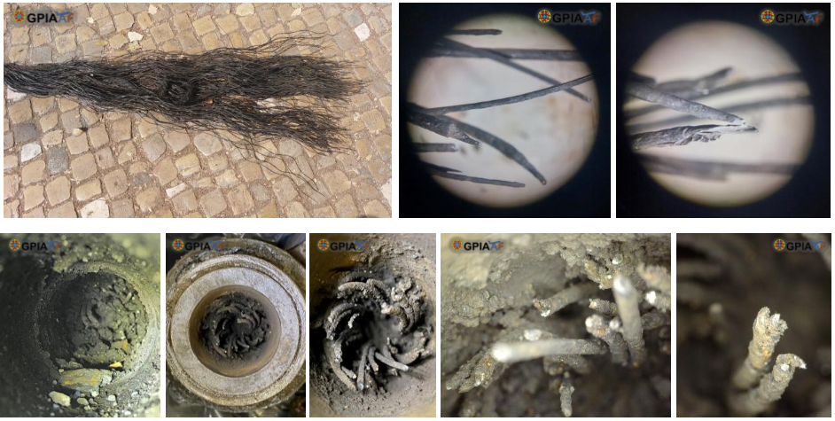 Der Bruch des Zugseiles erfolgte an der Verbindungsmuffe des Zugseiles von Wagen 1, nur wenige Zentimeter vom Vergusskegel entfernt. Eine makroskopische Analyse der Bruchenden der gebrochenen Drähte zeigt Brüche unterschiedlichen Alters, was darauf hindeutet, dass der Bruch schrittweise über einen längeren Zeitraum erfolgte und mehrere Brucharten umfasste. Wie aus Abb. 2 ersichtlich ist, war die Bruchstelle ohne Demontage des gesamten Drehgelenks – Zeitaufwand mindestens zwei Tage – visuell nicht zugänglich und daher auch durch Augenschein nicht kontrollierbar. Ebenso konnten die an den Seilen immer wieder durchgeführten magnetinduktiven Prüfungen aufgrund der Platzverhältnisse an der Unterseite der Wagen die letzten zwei Meter an beiden Zugseilenden nicht erfassen.